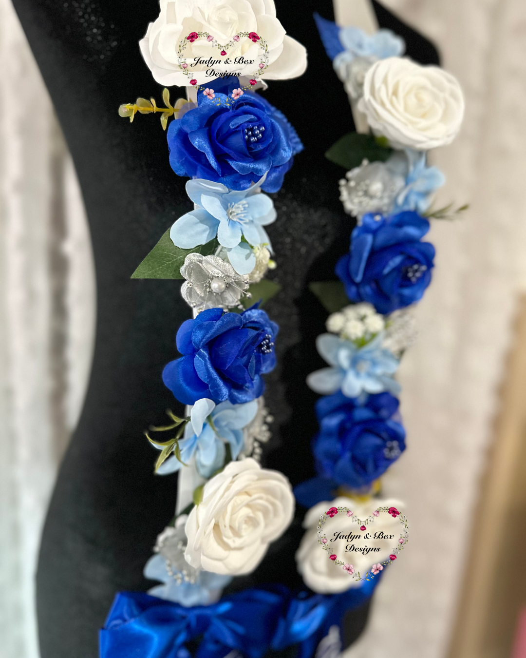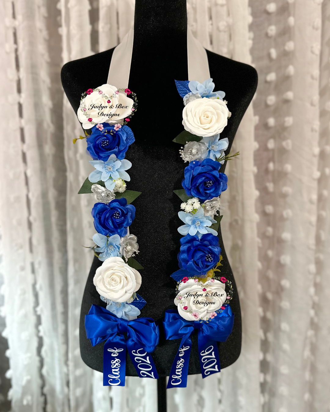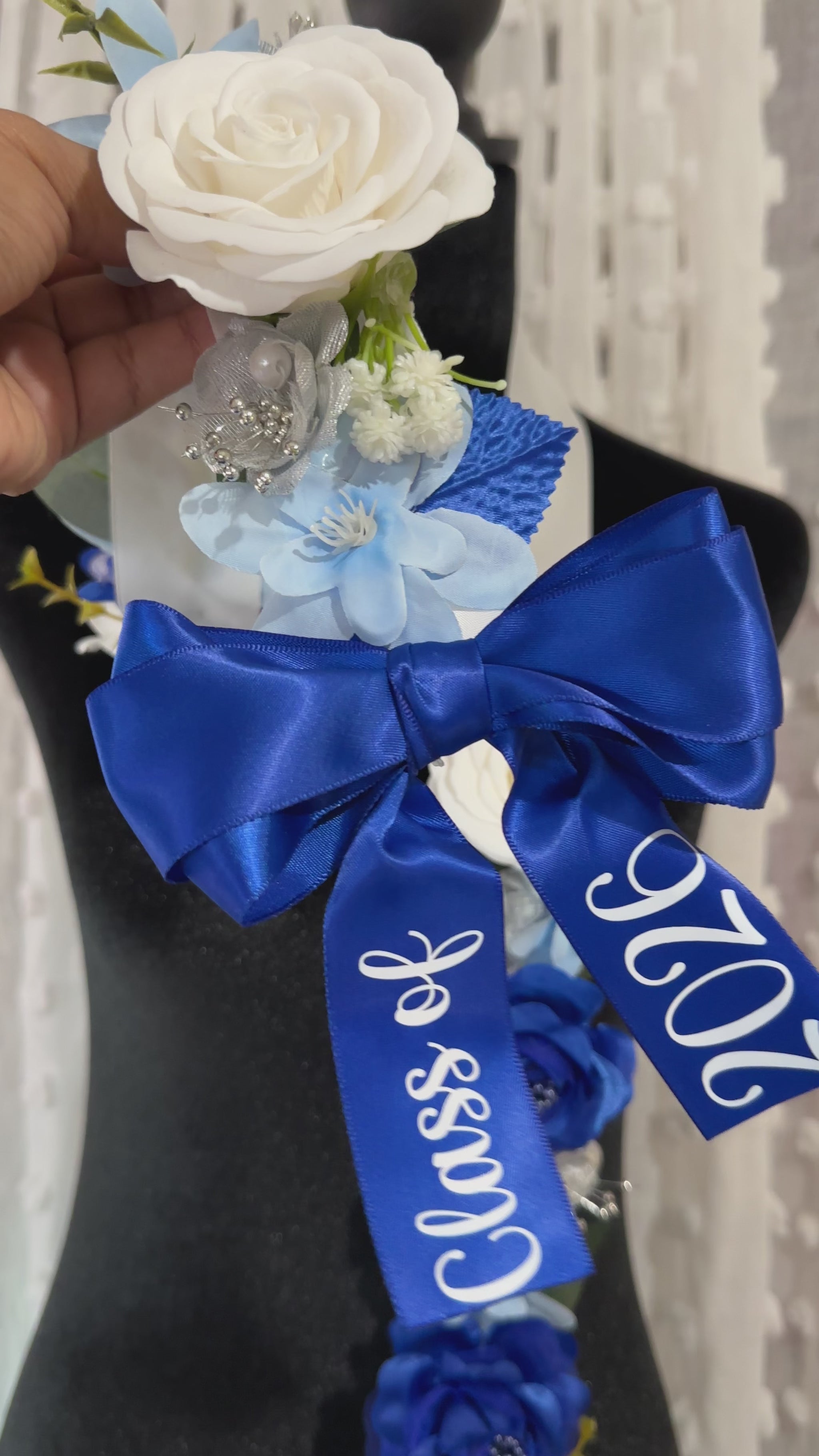 Celebrate graduation with this handmade Floral Graduation Lei – Class of 2026, designed in a classic and elegant blue-and-white color palette. This lei features a satin ribbon base adorned with premium faux florals in rich royal blue, soft baby blue, and crisp white tones, accented with delicate greenery and pearl details. Finished with blue satin bows and high-quality vinyl “Class of 2026” accents, this piece makes a timeless statement for graduation day.