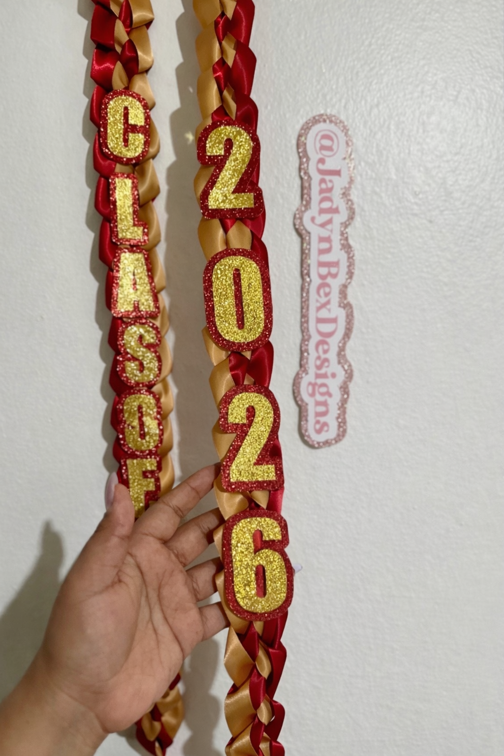 This design features our simple graduation lei style, made with a satin-finish ribbon and “Class of 2026” lettering crafted from glitter cardstock for a clean and timeless look.